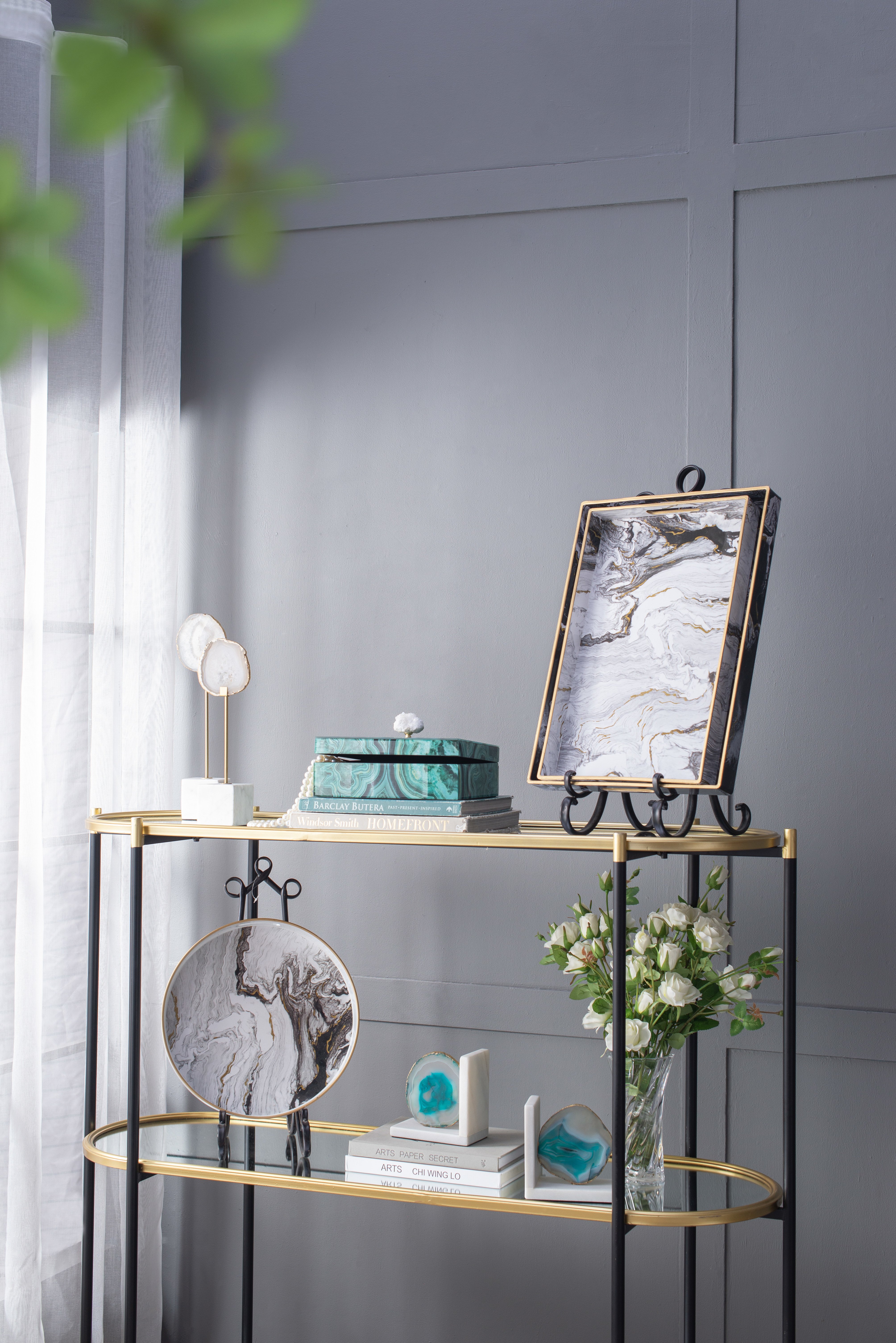 This large Bethany Marbled Jewelry Case in bluish-green features a dynamic, swirling pattern, glittering geode finial, and a touch of gold for an exquisite way to organize and store jewelry or other small items around the home or office. Use this box as a striking addition to a dresser, tabletop or shelf, or even as a meaningful gift to someone special.