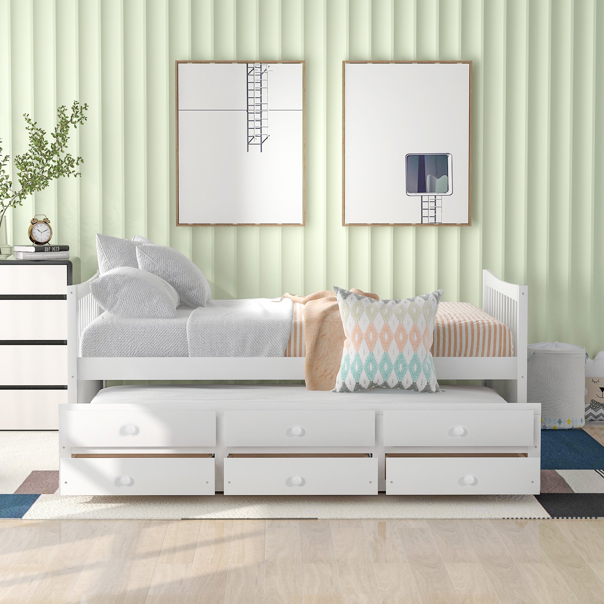 v [Maximized space] The daybed with handy pull-out trundle and three functioning drawers takes up minimal space for the spontaneous sleepover guest. The trundle and drawers can easily be pulled in and out for maximum storage space; perfect for organizing anything from clothes and bed linens to toys and games. Such a versatile piece; bringing functionality; versatility; and style to your home; perfect for those who have lots of visitors.