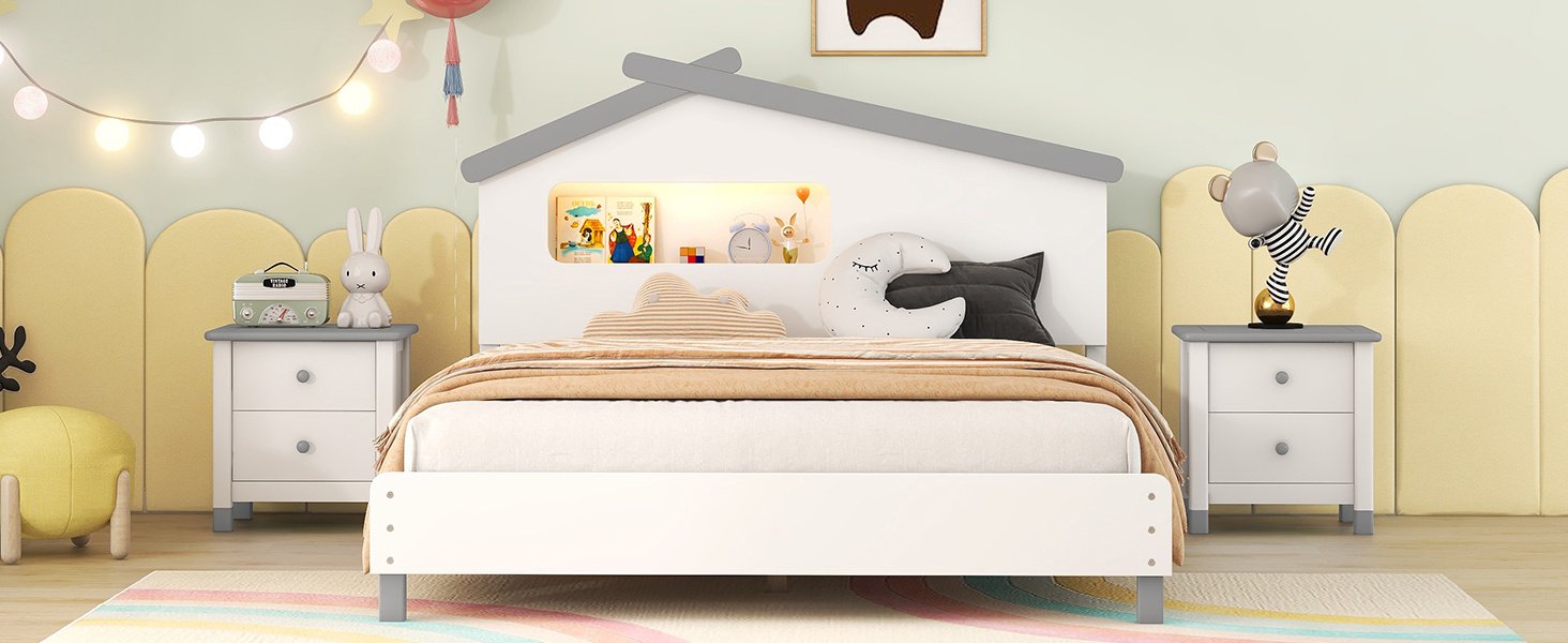 Full Size Wood Platform Bed with House-shaped Headboard and Motion Activated Night LightsThe headboard of this platform bed is in the shape of a house, the overall shape is full of interest. The motion activated nightlight will automatically light up when the human body is detected. Really a nice guide in the dark room.Let your kids no longer be afraid at night.Featuring strong, solid pine wood and supporting slats, this bed is built to last, ensuring it will accompany you for many years. Do not miss the chance take it home today.