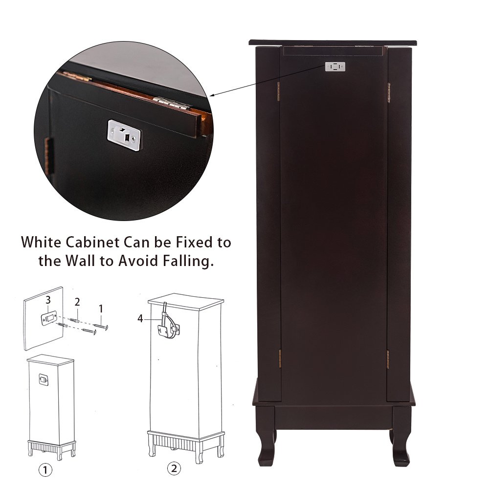 4. Sturdy Cabinet and Easy-to-Clean High Feet:The jewelry cabinet is made of thick and heavy-duty MDF material. The cabinet is of great wooden textured surface. The feet of the cabinet is not direct landing design but with a certain height.With this height, it is also easy to clean in daily life