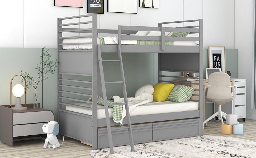 v [Designed for your familys safety] The upper bunk features a twin-length guardrail, while the bottom bunk is designed to include both a headboard and footboard. Along with the handrail, this bunk bed ensures top-notch security for your family. Whats more, the solid legs that made of solid pine wood can add strength and durability.