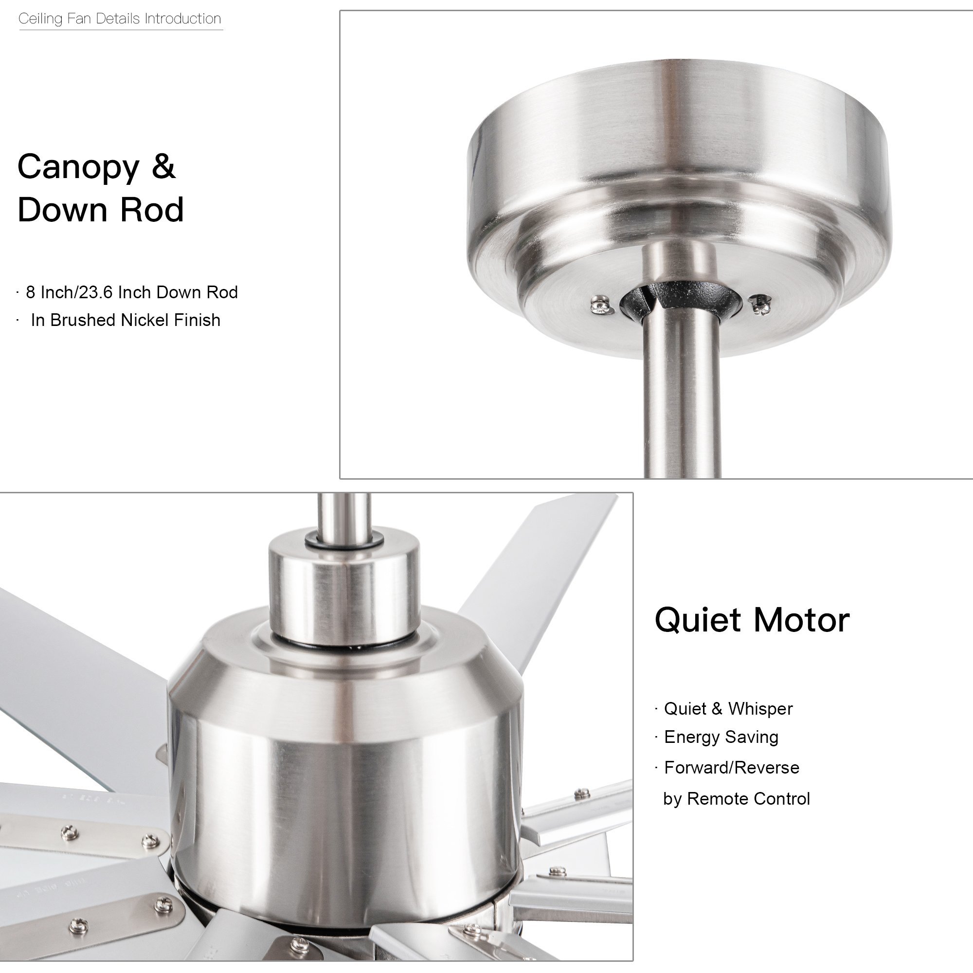 The YUHAO 72 in. Brushed Nickel Smart Ceiling Fan from YUHAO has 8 blades modern windmill design that will fit with many modern indoor or covered outdoor decors.The fan offers a variety of control options:included remote control,via your smart device (phone or tablet) with the Tuya App, or voice control with Alexa.The integrated dimmable LED light kit offers versatile lighting options.Choose from 3000K,4000k or 6500k light output options.The DC motor has 6 speeds and the included remote controls the power,dimming,color temperature,timer and speed functions